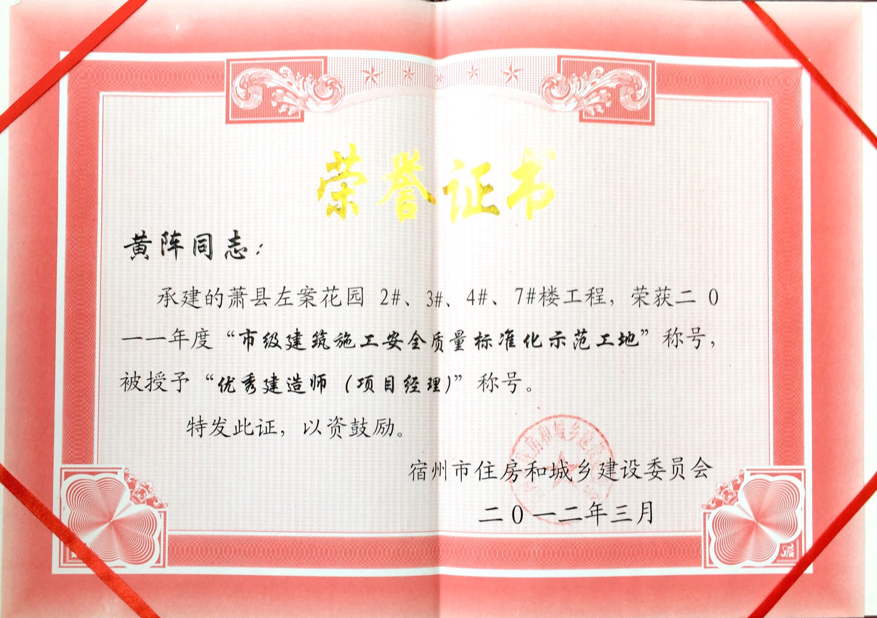 黃陣承建——蕭縣左岸花園2#、3#、4#、7#樓工程被授予優(yōu)秀建造師(項(xiàng)目經(jīng)理)