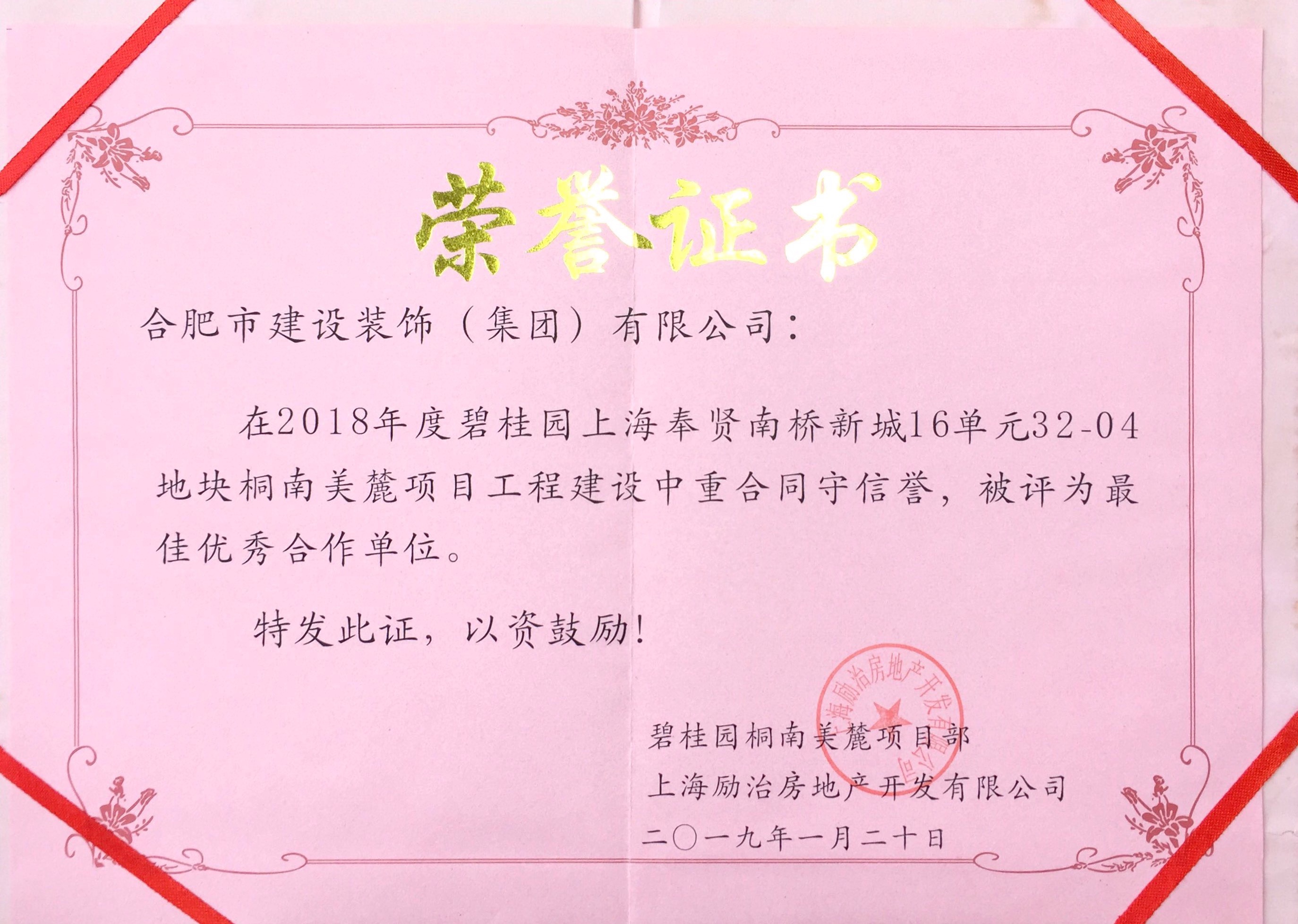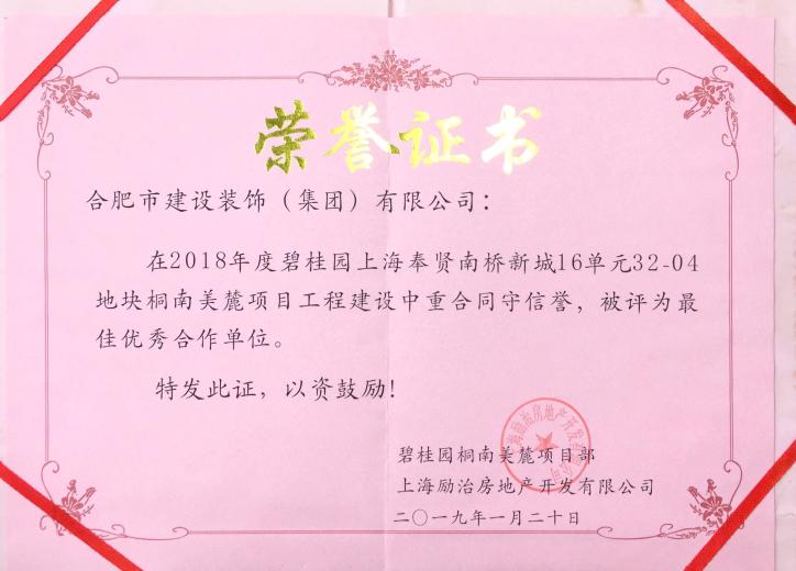 >2018年度碧桂園上海奉賢南橋新城16單元32-04地塊桐南美麓項目工程建設者重合同守信譽,被評為最佳優秀合作單位