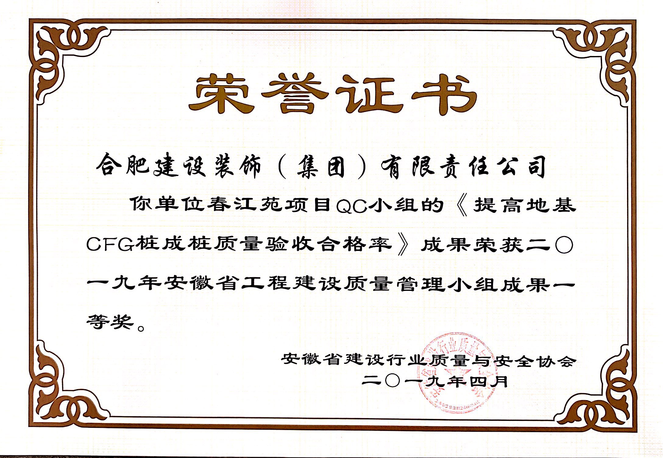 >2019年安徽省工程建設質量管理小組成果一等獎