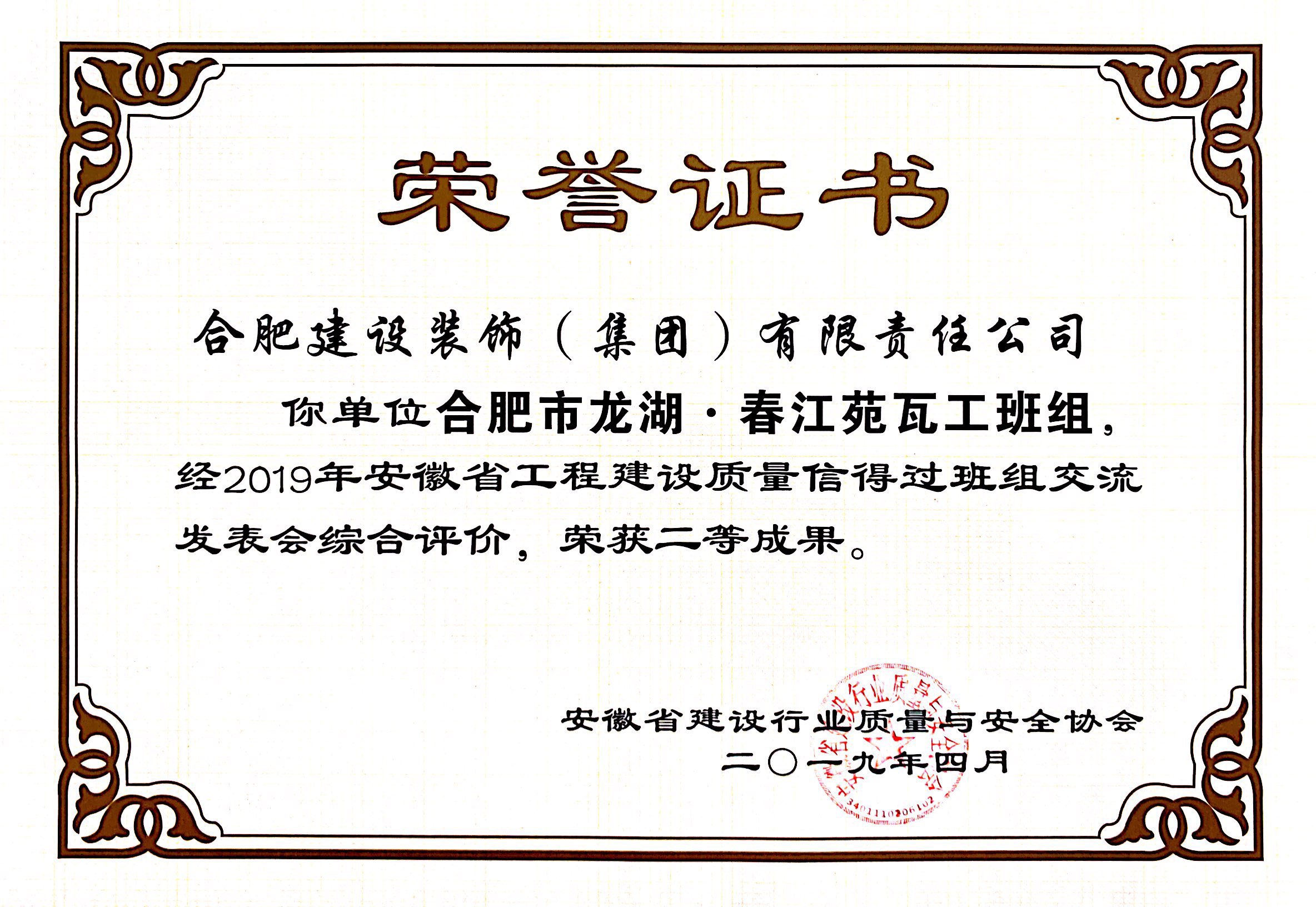 2019年安徽省工程建設質量信得過班組二等成果