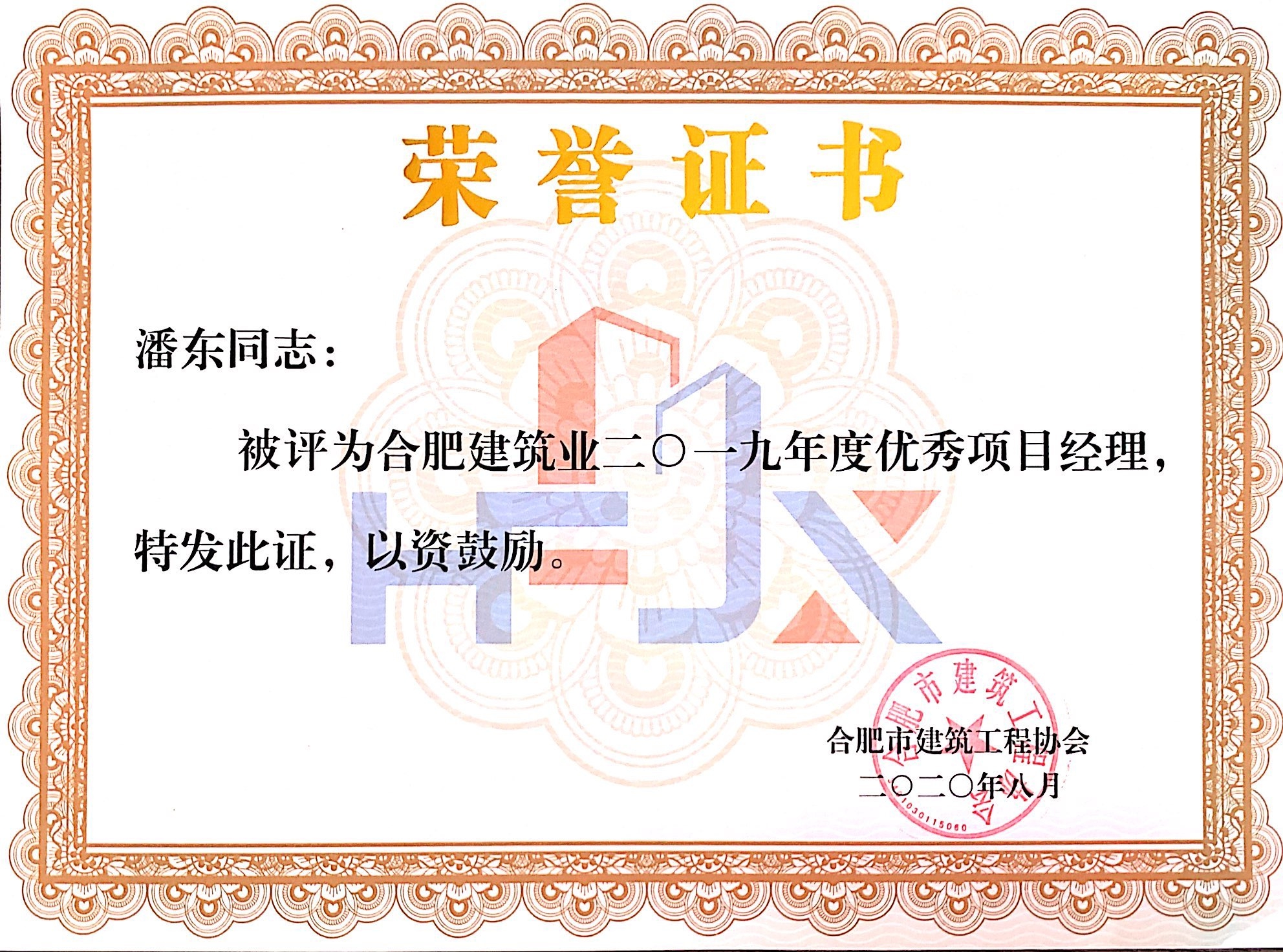 >合肥市建筑業2019年度優秀項目經理——潘東