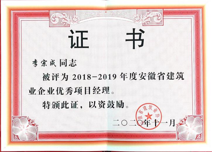 >2020年安徽省建筑業企業優秀項目經理--李宗成