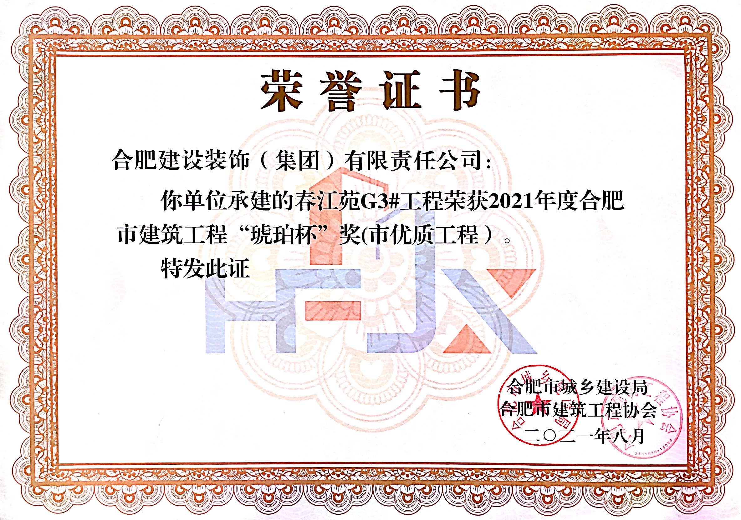 >春江苑G3#--2021年度合肥市建筑工程“琥珀杯”獎(jiǎng)(市優(yōu)質(zhì)工程)