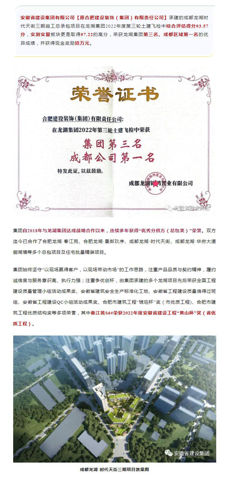 >成都時代天街項目土建飛檢榮獲龍湖集團第三名及成都區域第一名